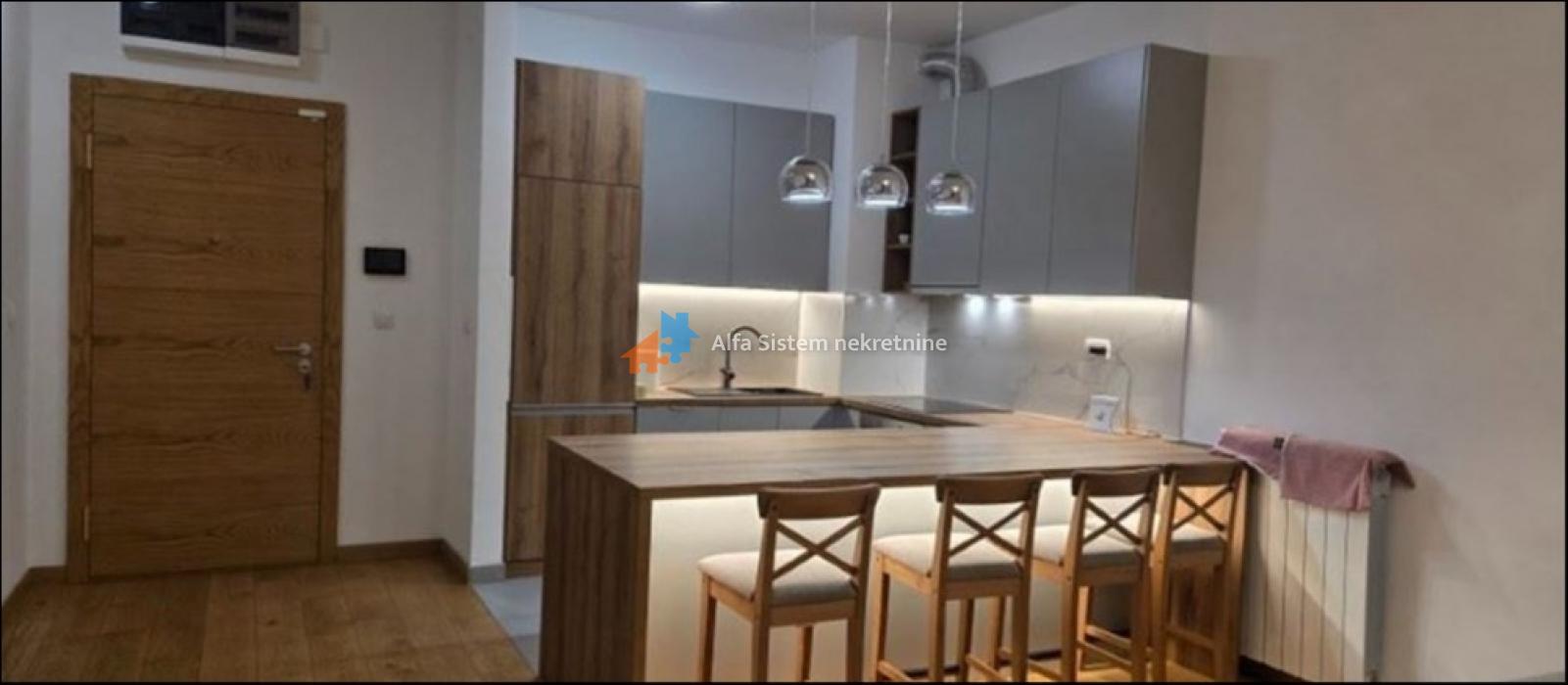 Stan se sastoji od dnevnog boravka sa kuhinjom i izlazom na terasu, spavaće sobe sa izlazom na terasu i kupatila. Potpuno je opremljen novom ugradnom belom tehnikom i kvalitetnim nameštajem, sa ALU-drvo stolarijom, višeslojnim parketom i dve inverter klima jedinice. Grejanje je centralno, uz mogućnost kontrole potrošnje putem smart home sistema.